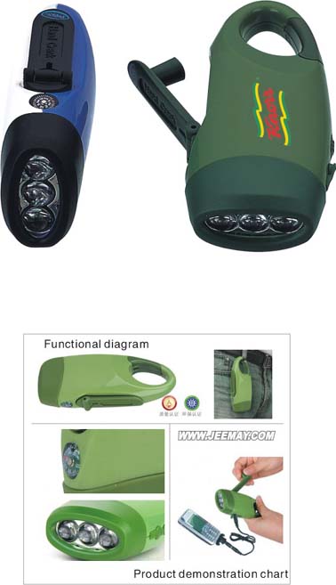 Cranking for power generating. Carabiner design, covenient to carry. Cranking 3ms to support 2--8ms mobile phone talking time. Max brightness: 50,000mcd. Extra mini compass.